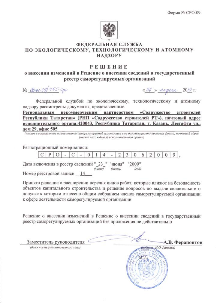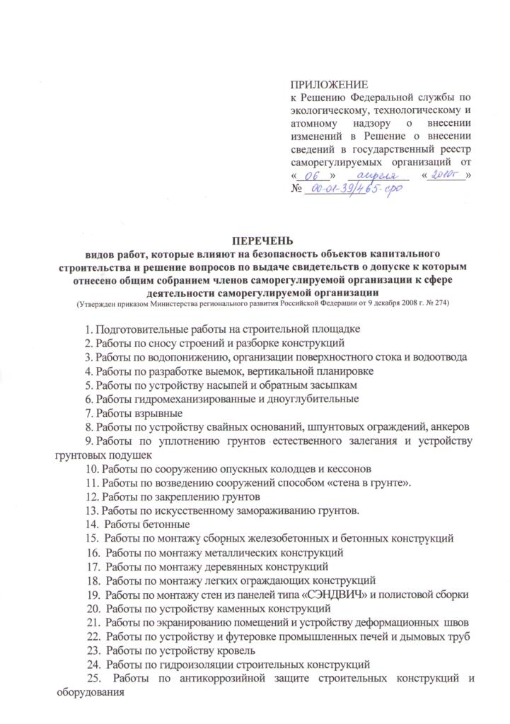 Решением Федеральной службы по экологическому, технологическому и атомному надзору от 6 апреля 2010 года № 00-01-39/465-СРО принято решение о расширении перечня видов работ: